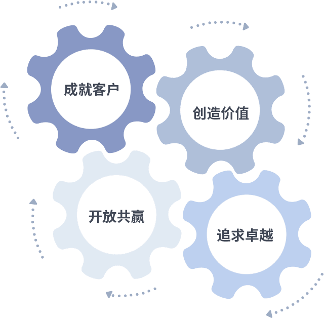 成就客户是一切决策的出发点,,,,创造价值是衡量所有工作的标准,,,,追求卓越是我们做事做人的态度,,,,开放共赢是我们的格局也是最终的结果。。。价值观的齿轮环环相扣,,,推动着组织里的每个人不断向前。。。